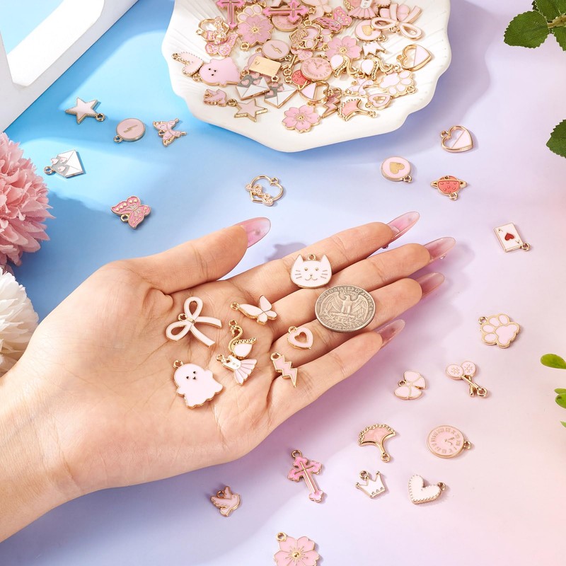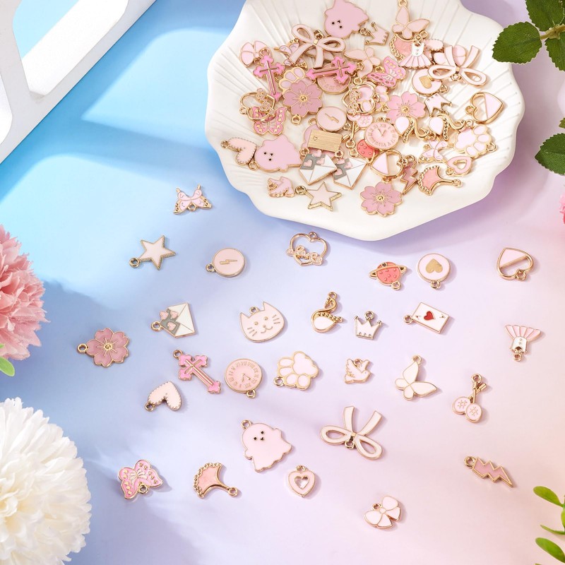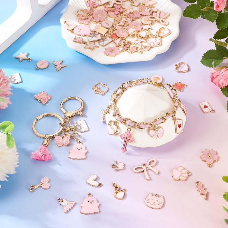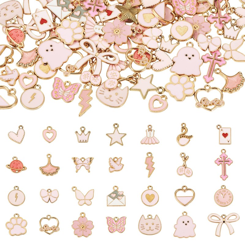 Magibeads 112Pcs Pink Enamel Charms for Purse Junk Case Bowknot Crown Swan Swan Butterfly Star Cross Flower Ghost Alloy Cute Earring Charms for Crafts DIY Keychain Jewelry Making Supplies
