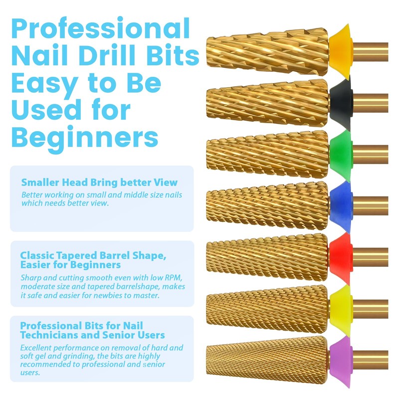 - Quantity: 1 piece | Grit: Double Fine | Coating: Gold Titanium | Color: Gold | Shank Size: 3/32" | Large Length: 1.58 Inches | Barrel: 0.23 Inches x 0.58 Inches | Design: Flat Top Tapered Barrel Nail Drill Bits.