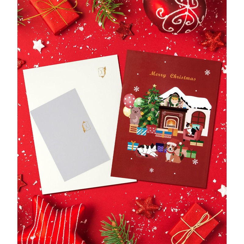 - 3D Pop-Up Holiday Scene: Features a beautifully crafted Christmas tree, stockings by the fireplace, gifts, and cute animals like a dog, cat, and bear to create a festive and heartwarming display.