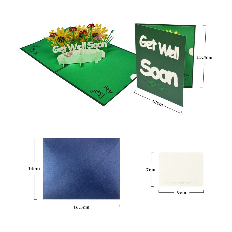 - Zubehoer - 3d Gute Besserung Pop-up-Grusskarte misst 130 x 155 mm. Das Zubehoer ist ein passender Umschlag, ein wunderschoener Umschlagaufkleber, eine exquisite Notizkarte, mit der Sie Ihre herzlichen Wuensche und Nachrichten aufschreiben koennen.