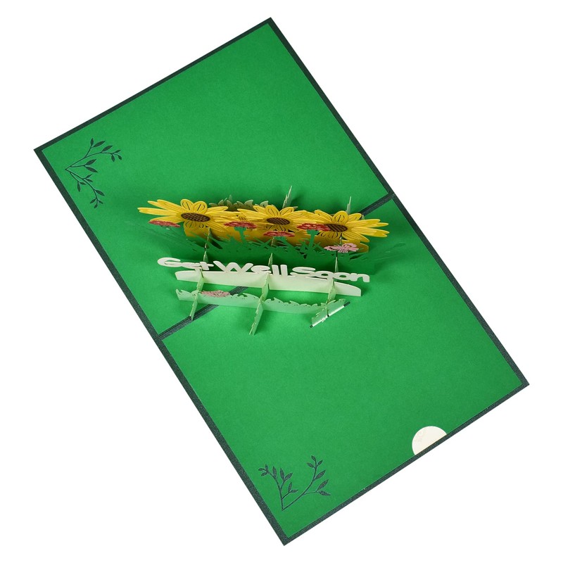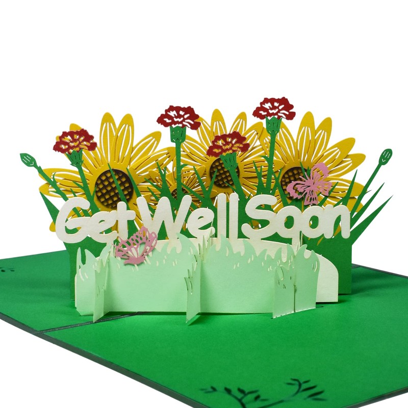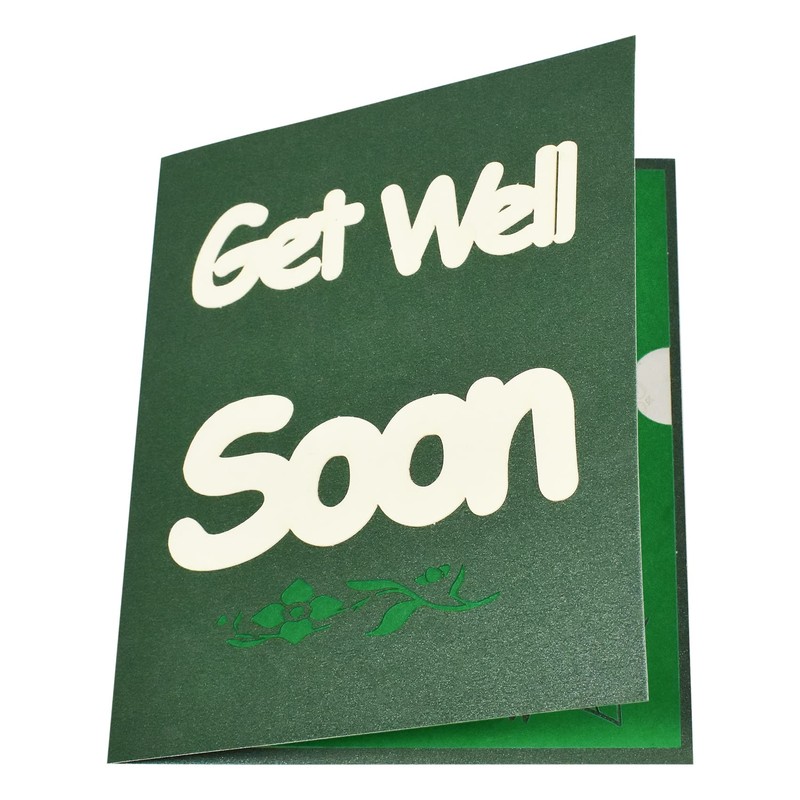 - Ueberraschungseffekt - Die Karte ist im gefalteten Zustand flach. Wenn die Karte geoeffnet wird, erscheint sie voller leuchtender Blumen, Inside verfuegt ueber einen aufwendigen Pop-up-Schriftzug "Get Well Soon". Es wird einen besonderen beruehrenden Moment schaffen.