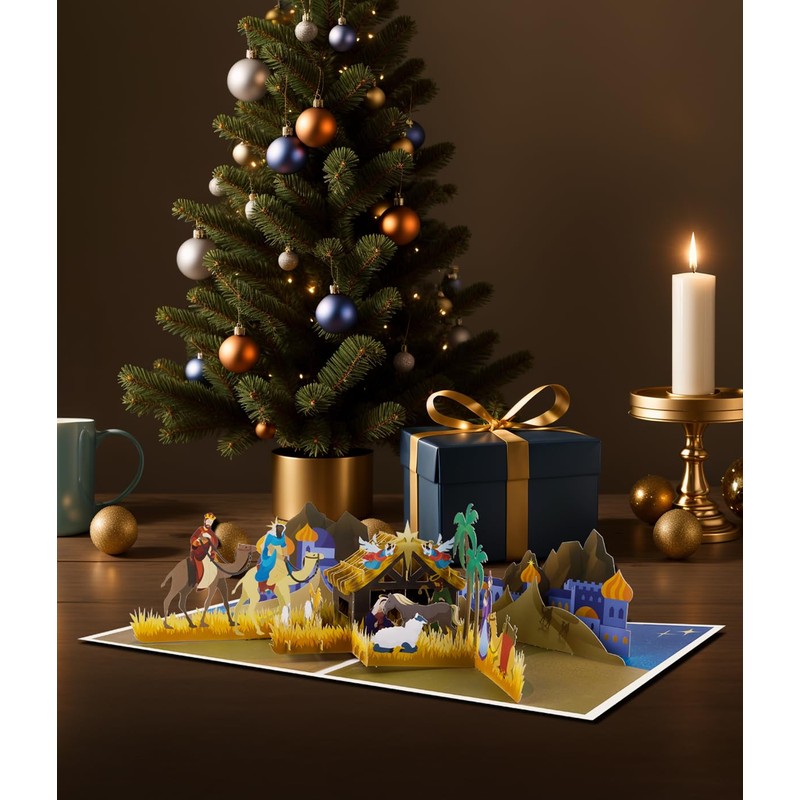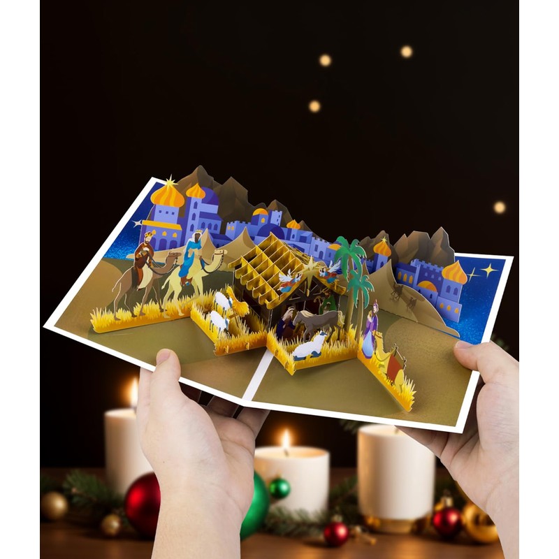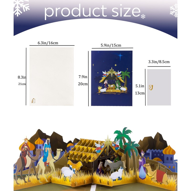 - Intricate 3D Design: Celebrate the true meaning of Christmas with this beautifully crafted Nativity Scene pop-up card. The detailed design features the Holy Family, Three Wise Men, and animals in a vibrant and picturesque setting.