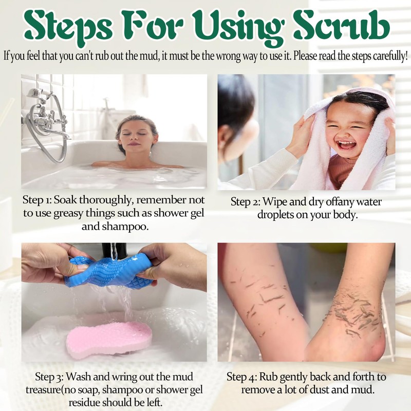 - 【How to Use】: step one, soak your body and sponge fully(do not use body wash); Step two, use a towel to dry the water droplets off your body; step three, wring out the water of the sponge; Step four, use the sponge to rub back and forth across the body.