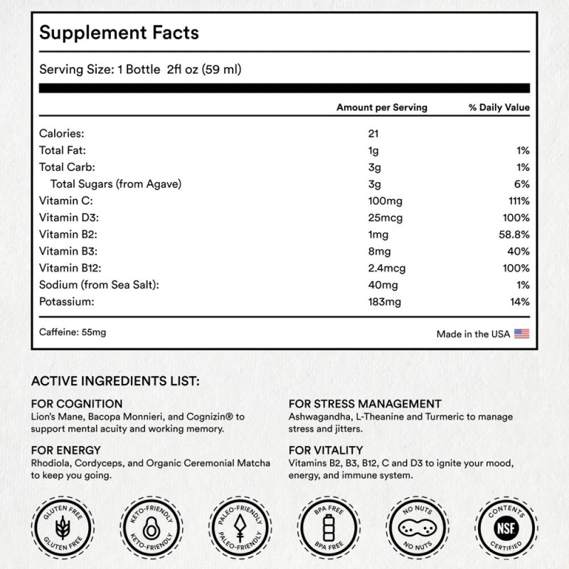 - Ingredients: Organic Lion's Mane Mushrooms, L-theanine, Organic Ceremonial grade Matcha, Organic Cordyceps Mushrooms, Organic Ashwagandha, Vitamin C, Vitamin B12, Cognizin Citicoline, Bacopa Monnieri, Turmeric, Vitamin B Complex, Vitamin D3, Rhodiola Rosea, Organic Agave, Organic Olive Oil, Citicoline Sodium, Chlorophyllin, Phosphatidylserine, Organic Natural Caffeine, Sea Salt, Saffron, Piperine