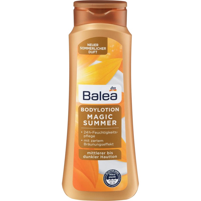 • For a summery fresh complexion and a pleasant feeling: the summery fresh Balea Magic Summer body lotion with a light fruity fragrance gives your skin an even, natural-looking tan. Formulation without microplastics and water-soluble pure synthetic polymers.