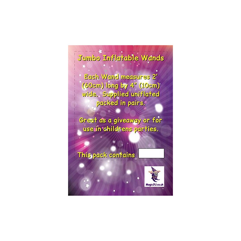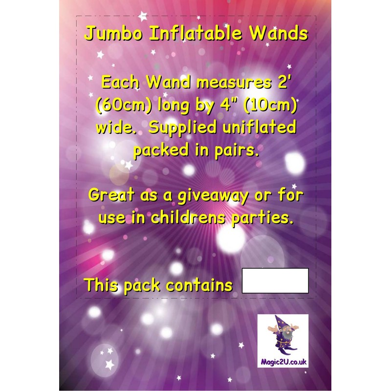 These 2' (60cm) jumbo inflatable wands come packed in pairs and are simply inflated with use of the included straw. Self-sealing they can be topped up at any time to prolong their useful life. They are great for performers to use, as giveaway or for parties. Each pack contains 10 wands.