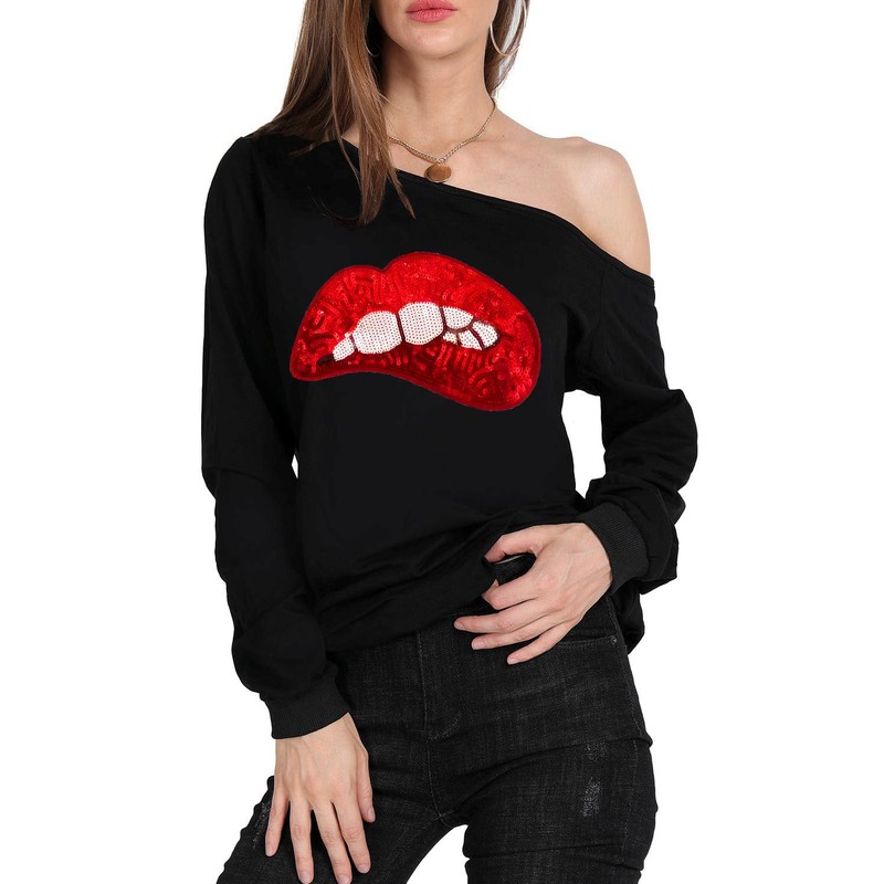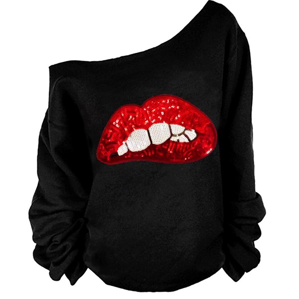 MAGICMK Woman’s Sweatershirt Lips Print Causal Blouse Off The Shoulder Long Sleeve Loose Slouchy Pullover Plus Size Tops…(S)
