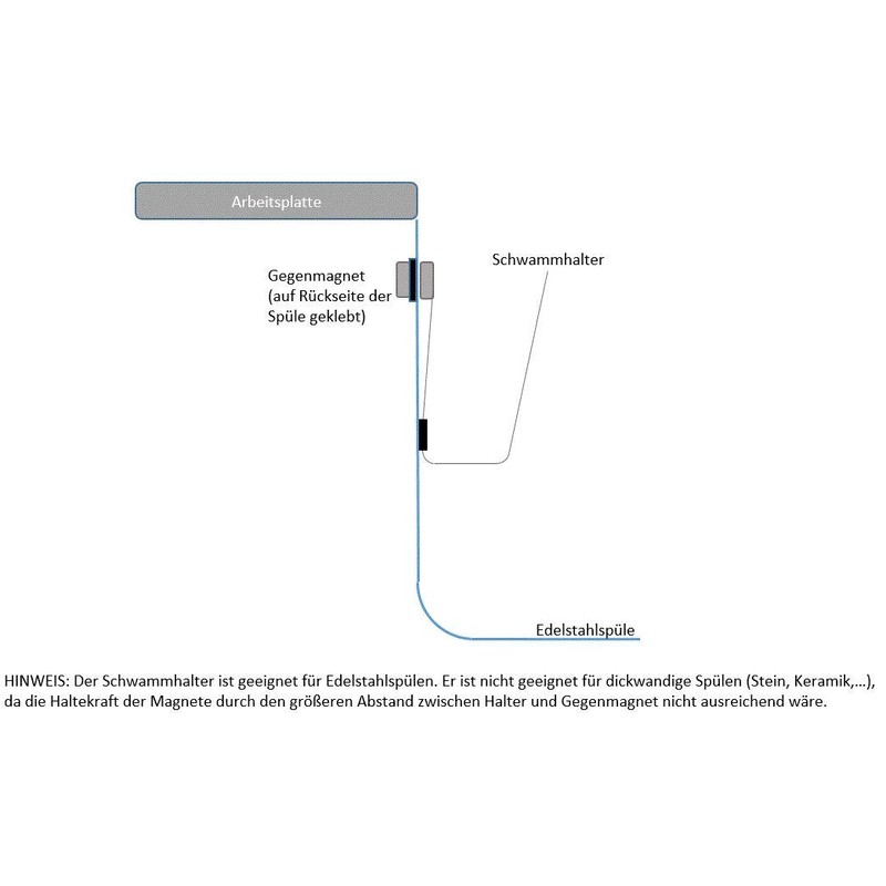 The sponge holder consists of 2 parts: the holder and the counter magnet. This means that it can be easily installed in stainless steel sinks without any tools. Please note: the holder is not suitable for thick-walled sinks such as stone sinks.