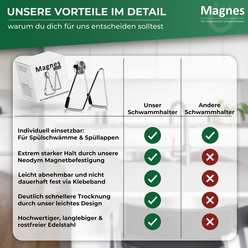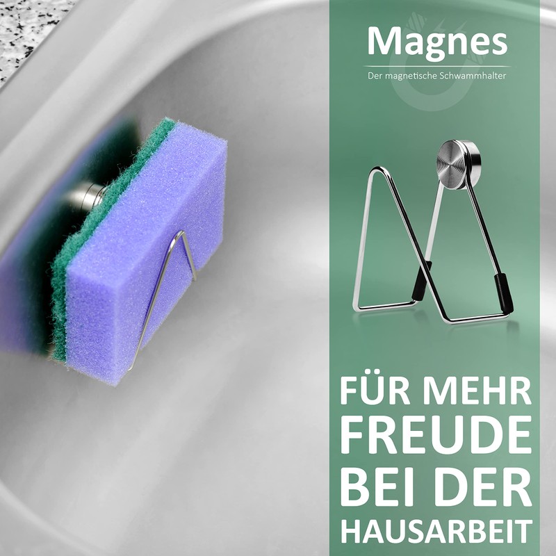 - Magnetic attachment: the sponge holder sits safely and securely thanks to the strong magnetic attachment. You can also easily remove and reattach it at any time and don't have to worry about suction cups that fall off or the sticky residue from glued holders. The holding force of the magnet is designed for the wall thickness of stainless steel sinks