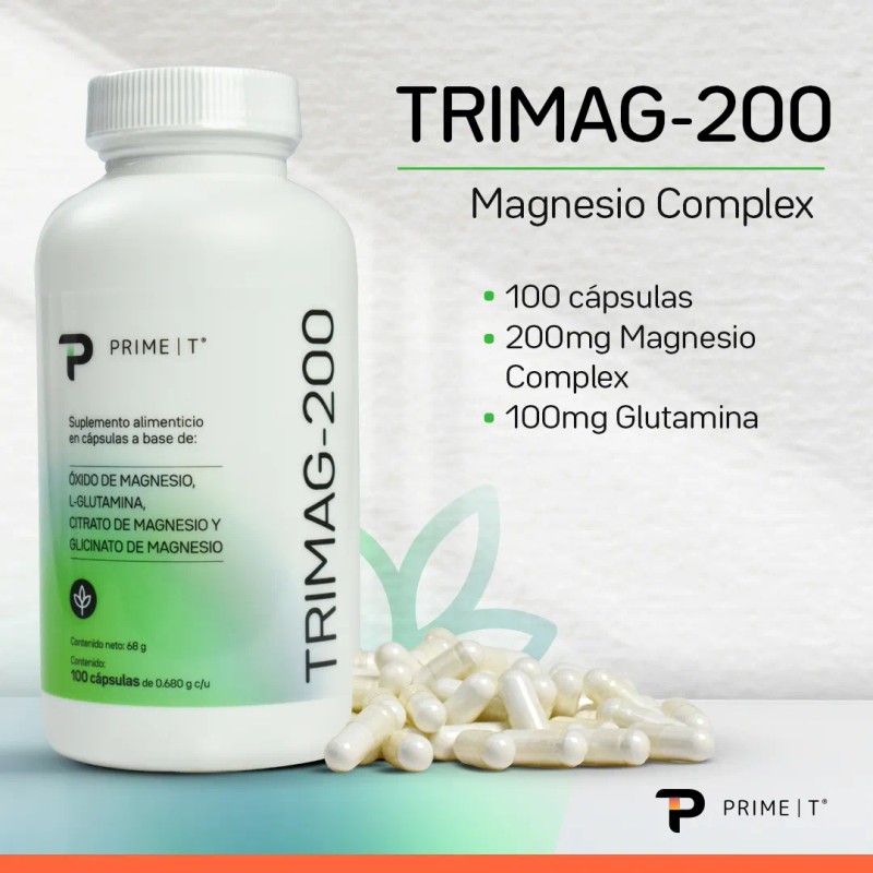 Magnesio complex Trimag-200 Primetech 100 Cáps con la dosis ideal que mezcla Citrato de Magnesio, Glicinato de Magnesio y Óxido de Magnesio, promueve la salud celular y metabólica