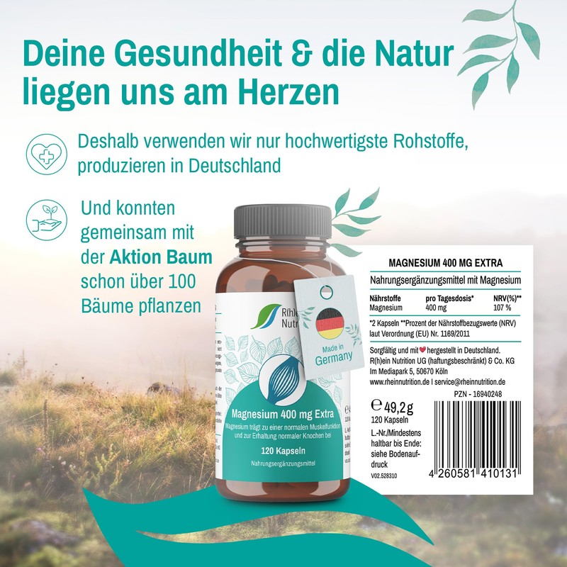 Magnesium 400 mg - Magnesium Capsules High Dose - 120 Capsules - Muscle Bone - Vegan Without Additives Made in Germany - Rhein Nutrition