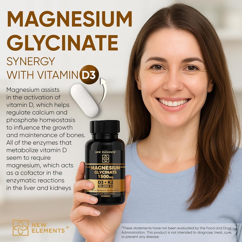 Magnesium Glycinate 1500mg with Vitamin D3 10,000 IU & K2 MK-7 – High Absorption Vegan Capsules for Muscle, Bone & Immune Support – 60 Count, Non-GMO & Gluten-Free