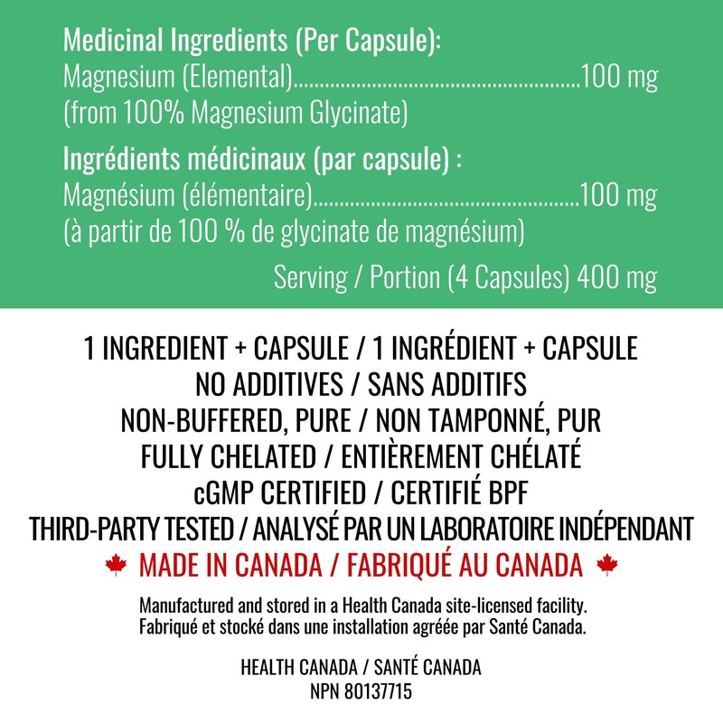 Magnesium Glycinate Supplement - 124 Capsules x 100 mg Elemental Magnesium - Non-Buffered (Pure), Chelated (High-Absorption) Bisglycinate - For Good Health and Sleep - Made in Canada - Nutritionn