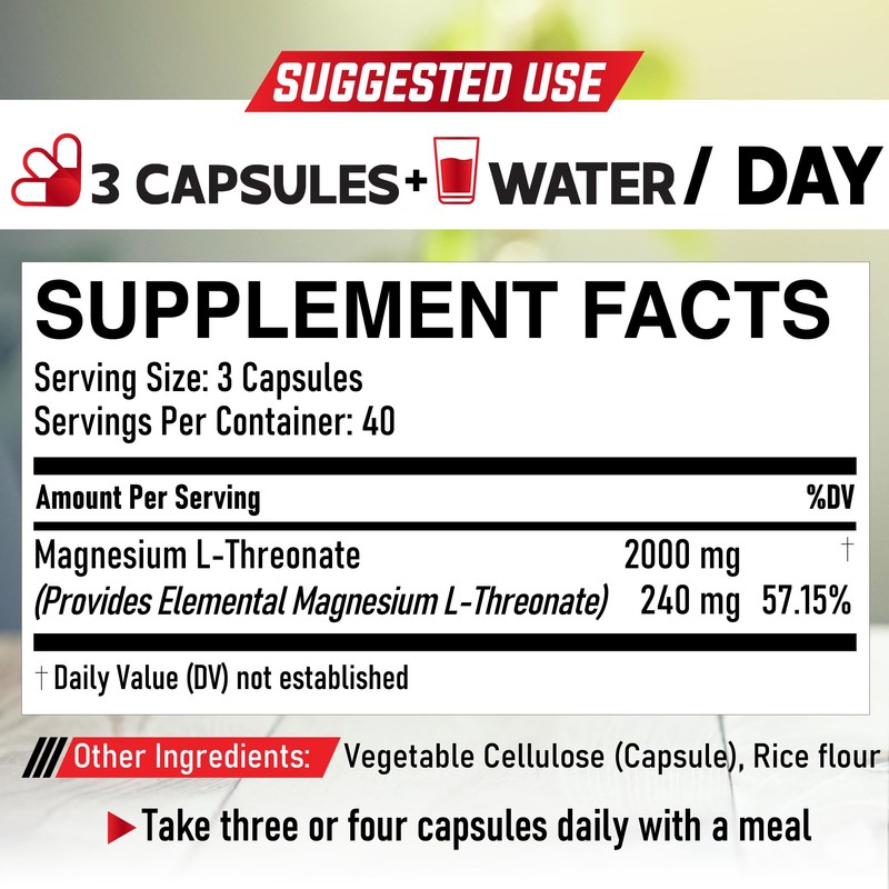 - ☑️ Ideal Daily Intake: Consume 3 daily capsules, delivering 2000mg of Magnesium L-Threonate. Each pack has 120 capsules, enough to accompany you through 40 days of wellness. Our Magnesium pills offer versatility. Easy to use and suitable for vegetarians.