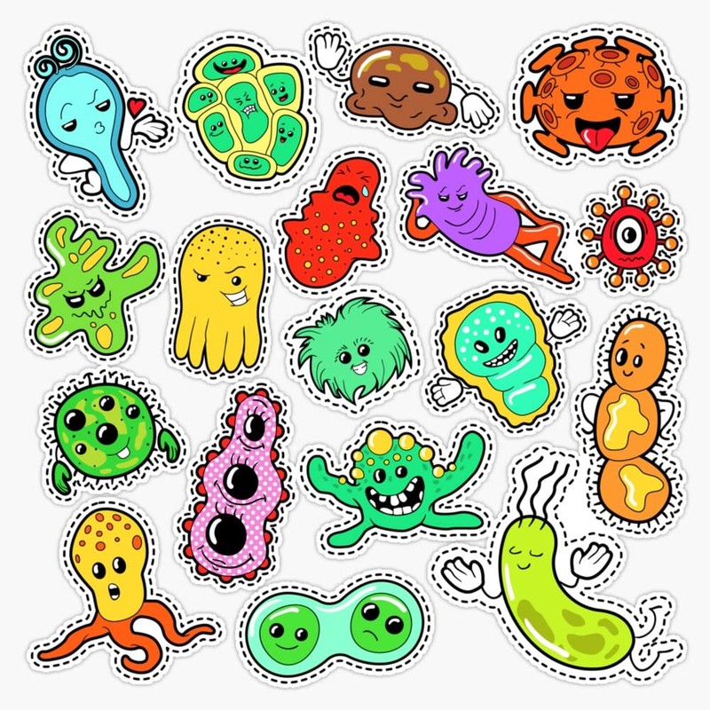 Magnet Funny Characters Bacteria and Microbes Set for Badges Patches. Vector Doodle Magnetic Vinyl Sticker 5"