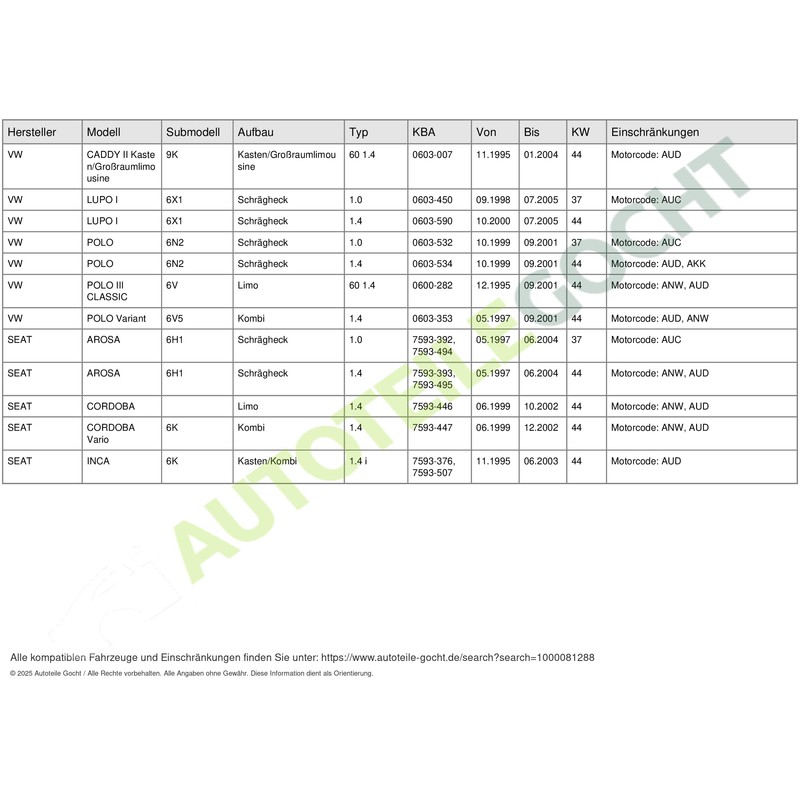 For Polo Classic (6V2) 60 1.4 (1995-2001) (1390 ccm, 44 KW, 60 HP).