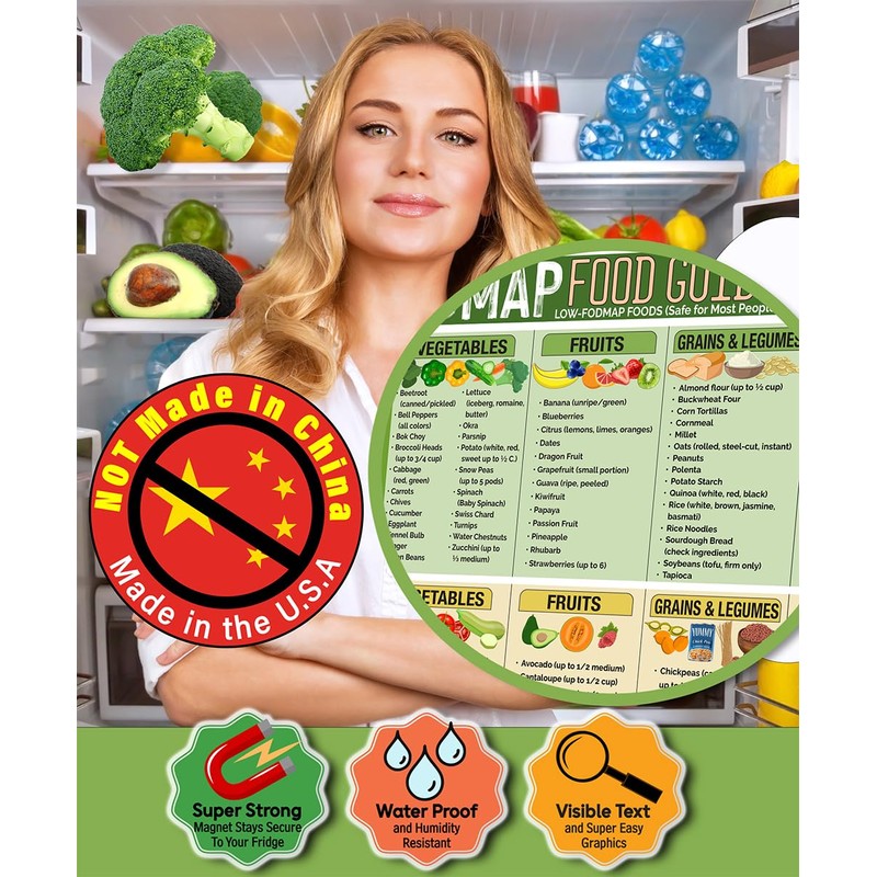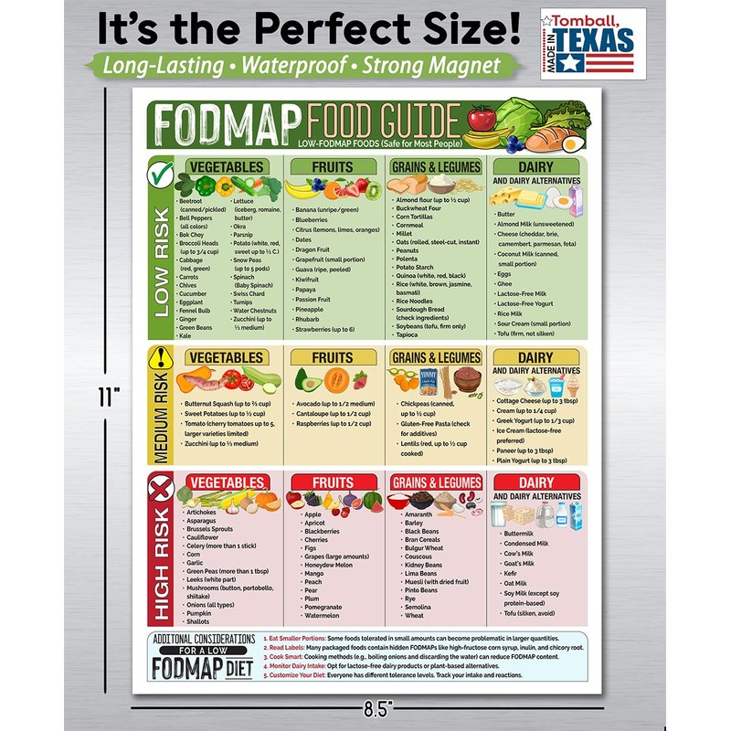 • Proudly Made in Tomball – Created and packaged with care in Tomball, Texas, this 8.5" x 11" nutrition reference poster reflects our commitment to quality. Designed for long-term use, it includes everything from Low FODMAP medium and high-risk foods to a dietary restriction guide. Whether tracking safe foods for IBS or organizing a Low FODMAP meal plan, this fridge magnet keeps healthy eating simple and accessible.