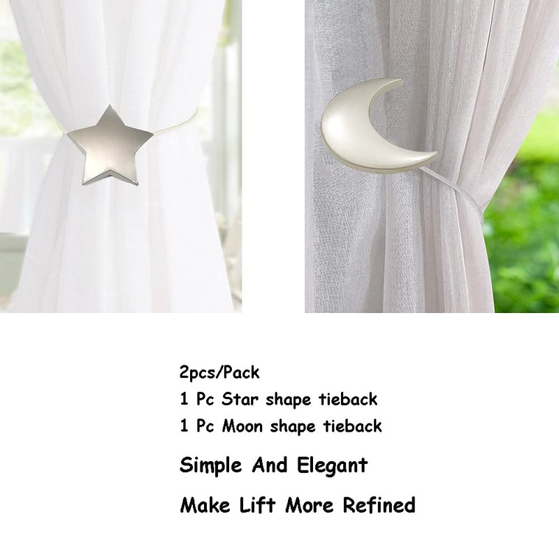 - [ Package Including ] 2pcs/pack (1pc Silver Alloy Moon & 1pc Star shape Curtain tiebacks (Size: Rope length 40cm/15.5", Moon or star : 6cm/2.36"), 100% Risk Free Purchase - Our Curtain Clips With 60 days money back or replacement guarantee, If there any problems please contact us feel free we will reply you within 24 Hours and give you a satisfied solution