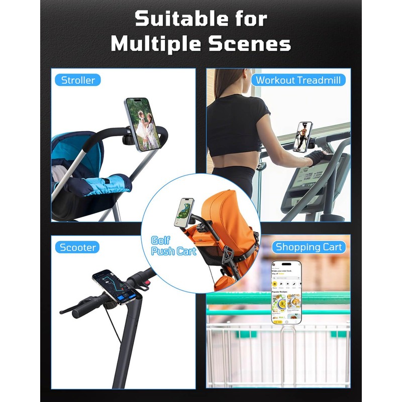 <p><b>Magnetic Golf Push Cart Phone Holder MagSafe Hands-Free 360° Adjustable with Strong Magnets Phone Mount Compatible with Clicgear, Bag Boy, Sun Mountain, Golf Push Cart Accessories for All Cell Phones </b></p><ul> <li><b>Magnetic & Universal Compatibility</b></li></ul><p>Upgrade your golf game with this golf push cart phone holder, featuring 23 N52 magnets for unbeatable stability. Works with all smartphones: iPhone 12–16 attach directly via MagSafe, while other phones use the included metal ring/plate. Perfect as a push cart phone holder, clicgear magsafe phone holder, or golf push cart cell phone holder, compatible with Clicgear, Bag Boy, Sun Mountain, and most push carts with 0.7"–1.26" handles.</p><ul> <li><b>360° Adjustable & One-Hand Magnetic Snap</b></li></ul><p>The 360° rotating ball joint lets you adjust your phone for GPS, scoring, calls, or videos at the perfect angle. With its one-hand magnetic snap, this golf push cart phone mount for golf push cart locks your device instantly, saving time to focus on your swing instead of fiddling with clamps.</p><ul> <li><b>Fast Installation & Versatile Use</b></li></ul><p>The twist knob clamp ensures quick, tool-free installation, while silicone padding prevents scratches and adds grip. Also works as a shopping cart phone holder or stroller phone holder, offering a secure, reliable, and hands-free solution on and off the course.</p>