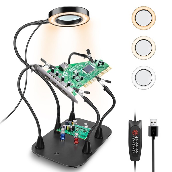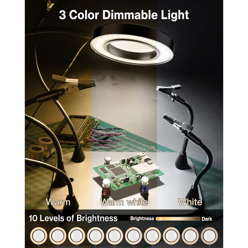 - See Every Detail in Stunning Clarity: The 3X magnifying glass with built-in lighting zooms in on even the smallest circuits, making repairs a breeze. Can easily switch 3 color temperatures and 10 brightness levels. Perfect for helping hands soldering station circuits or setting gemstones