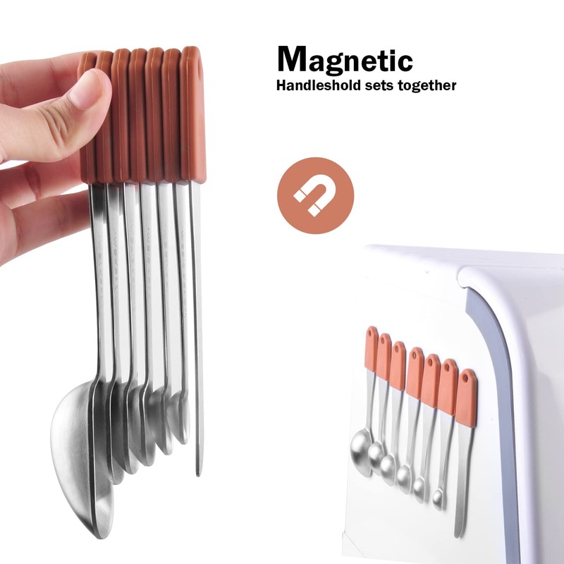 - Strong Magnetic Feature for Easy to Use & Store: The measuring cups and spoons all with strong magnets embedded on the handles make it easy to stick them on your refrigerat or hang up them, and keep them together in your utensil drawer, perfect for limited storage space. No trouble in picking one up for use and then putting back stacked for storage.