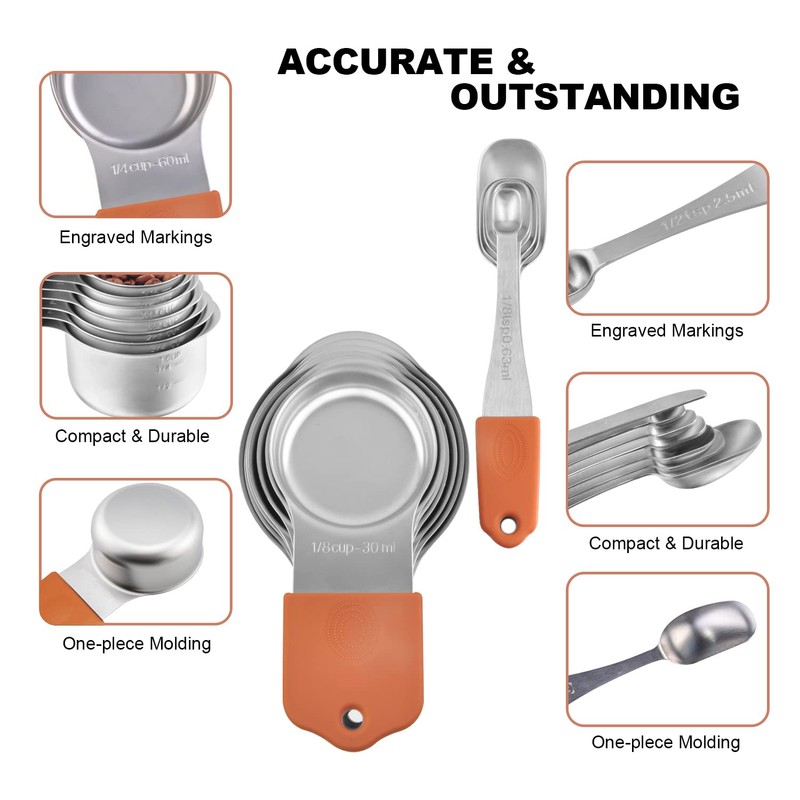 The accurate engraving on each of the measuring cups and spoons helps any pro or novice chef cook easier, are safe to use for both dry and liquid ingredients, Ideal for measuring flour, sugar, butter, coffee, spices, herbs, water, sauce, nuts and grains.