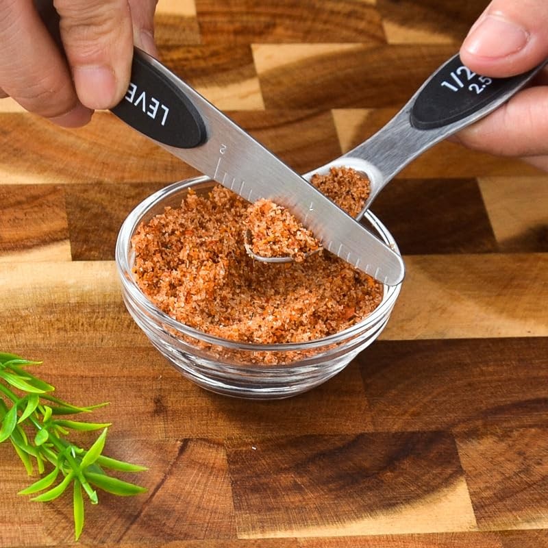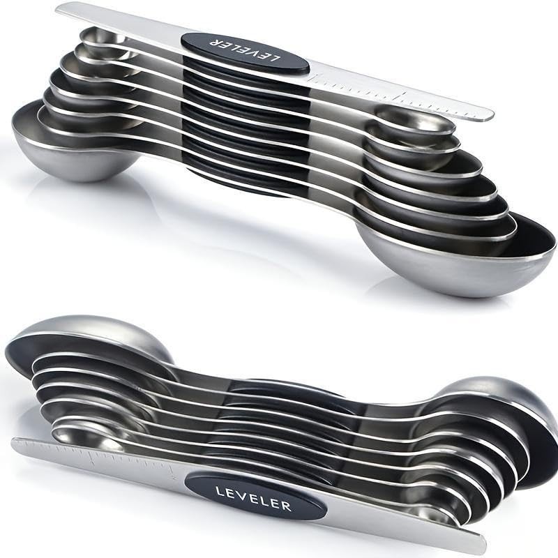 - [Easy to carry and store] These magnetic spoons let you use one spoon at a time and then they nest together for easy storage. Quickly grab the spoon you need without having to fumble with opening and closing a ring. They can save space in drawers or cabinets, metric measurement markings that are easy to read and won't fade or rub off.