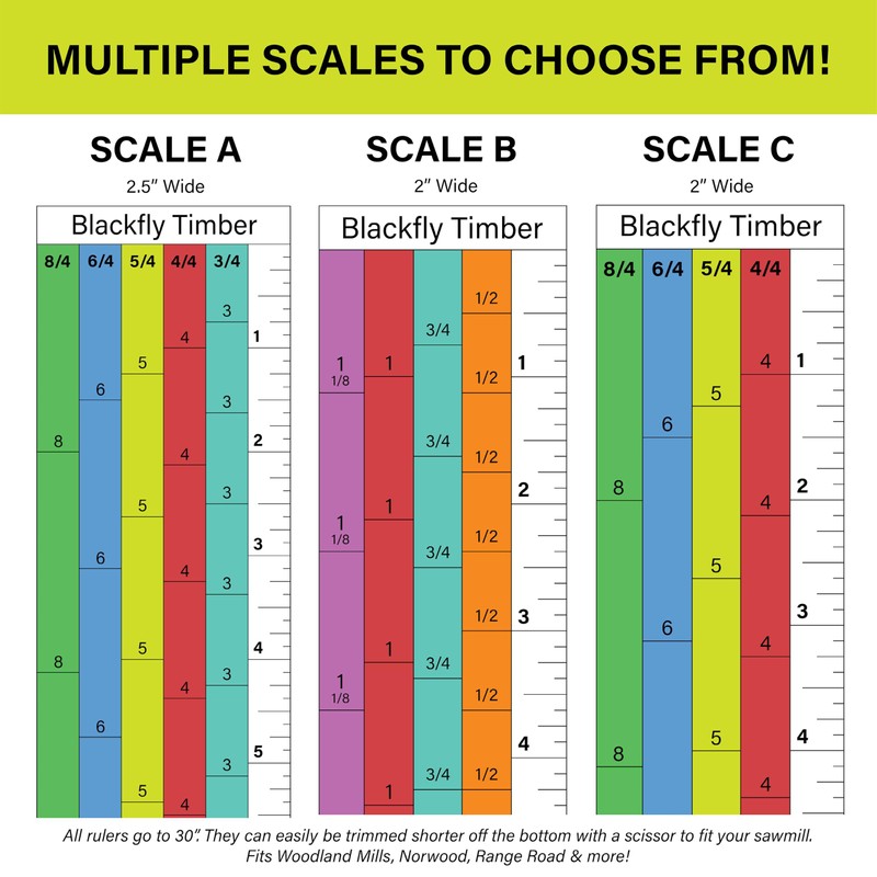 High quality magnetic lumber scale. This scale works with Woodland Mills, Range-Road, Ducar, Princess Auto, Norwood and other bandsaw mills that use this type of scale. The colored sections of the scale includes a 1/8" kerf. The ruler on the far right is a standard ruler. High quality print. Durable. Strong magnet but easily removable. Displays 4/4, 5/4, 6/4, 8/4"(1", 1.25", 1.5", 2"). Ruler goes to a height of 30 inches. Ruler can easily be cut shorter to fit smaller mills. Scale dimensions are 2"x30.5"