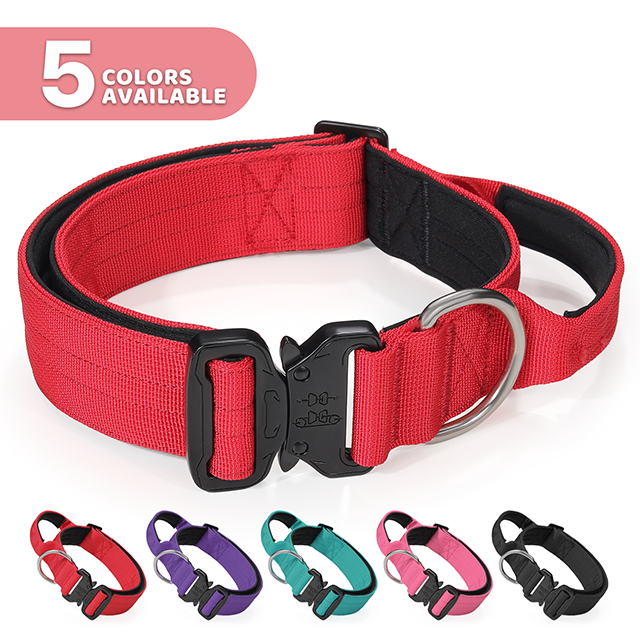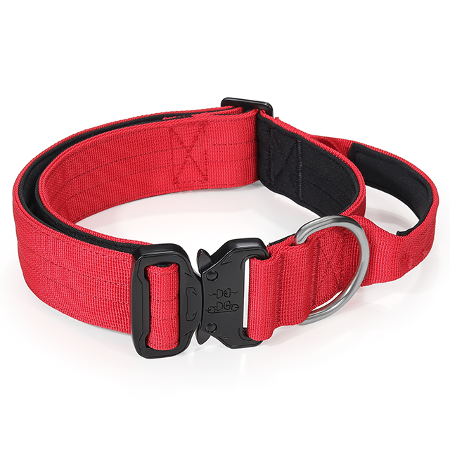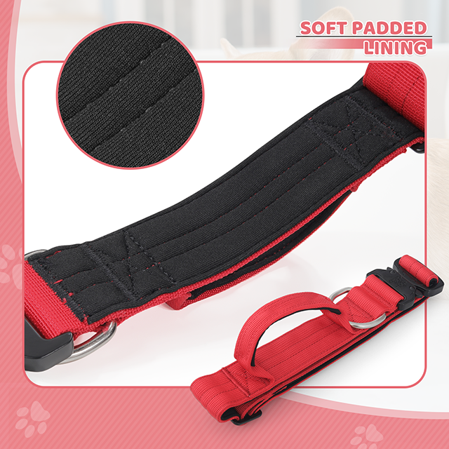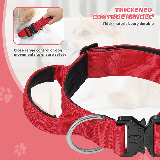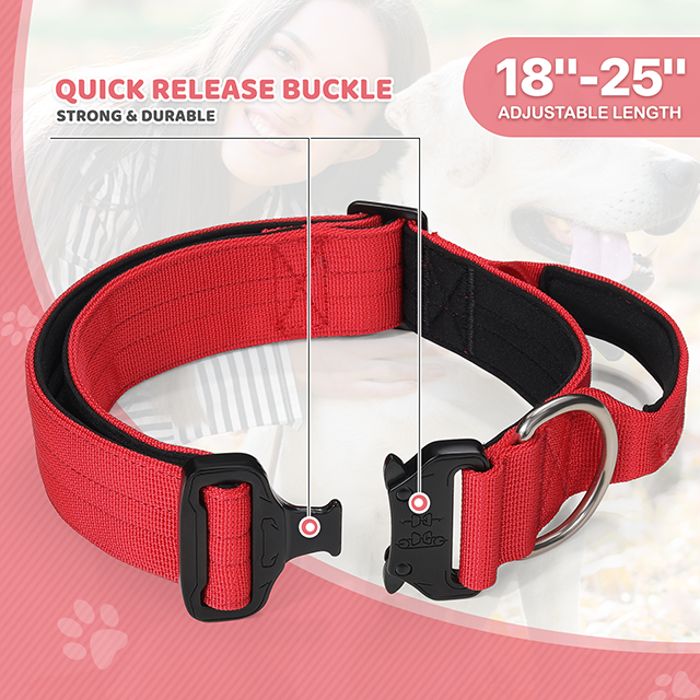 Outfit your large breed with our tactical dog collar, engineered for durability and comfort. Made from tough nylon and cushioned for active use, this collar features a strong handle and heavy-duty D-ring for secure leash connections. The quick-release buckle offers easy size adjustments and swift removal. Ideal for training, everyday walks, or outdoor adventures, it ensures your dog’s safety and comfort in any setting. Perfect for active, large breeds, our collar supports your adventures while providing the control you need.
