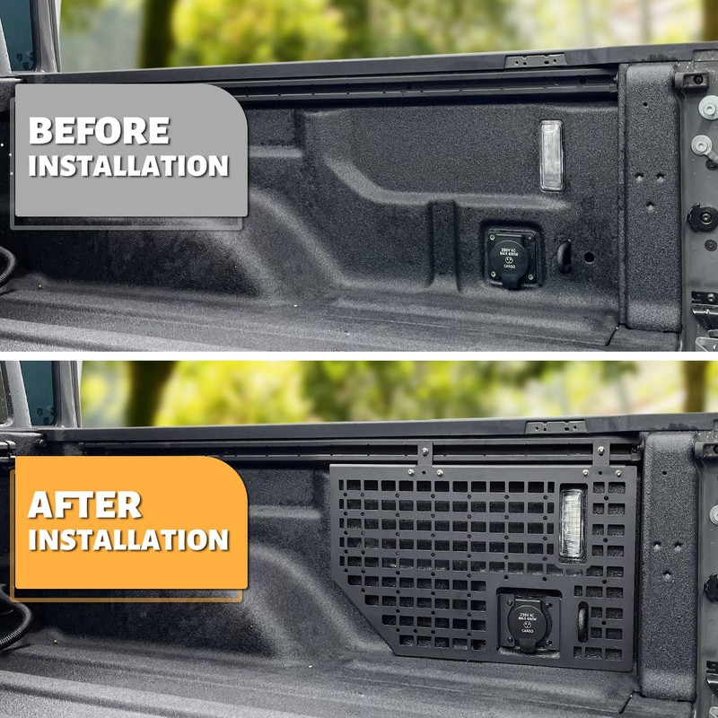 - 【EASY INSTALLATION】Our Side Bed MOLLE Panel is designed to bolt directly onto your vehicle's stock mounting holes. No drilling or cutting required. No need to make any modifications to your beloved gladiator!