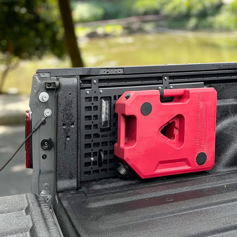 There are a lot of dead space in the bed of the Gladiator JT. The system is designed to maximize storage space by utilizing the bedside. Offers customizable mounts for a variety of tools and gears: Molle bags, traction gears, tools, high lift jacks, shovels and more.