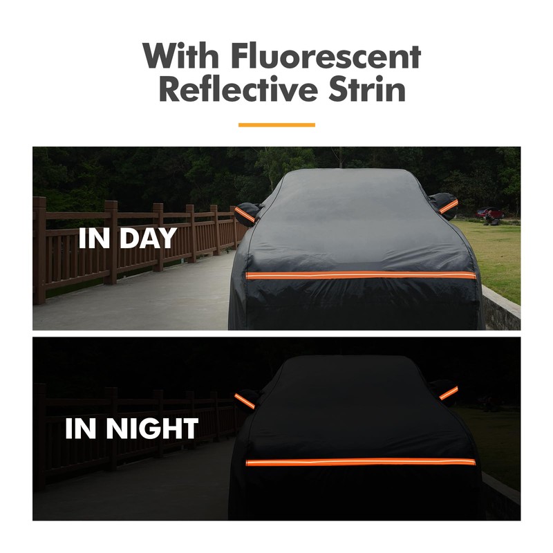 - 【Windproof & Waterproof】The windproof car cover is stable in storms. Equipped with four buckles at the bottom to protect the car cover from blowing away in heavy winds or storms. Zipper area double-stitched with waterproof seal and 360° reflective stripes + zipper glow tag for night safety.