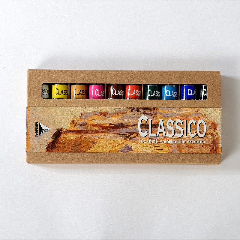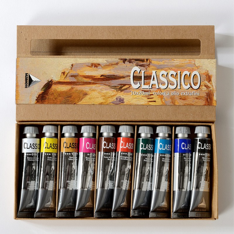 - Set of 10 aluminium tubes of 20 ml in the colours: titanium white, primary yellow, lights ochre, primary red - magenta, burnt siena, vermilion red light (imit. ), phthalo green, primary blue - cyan, ultramarine light, ivory black