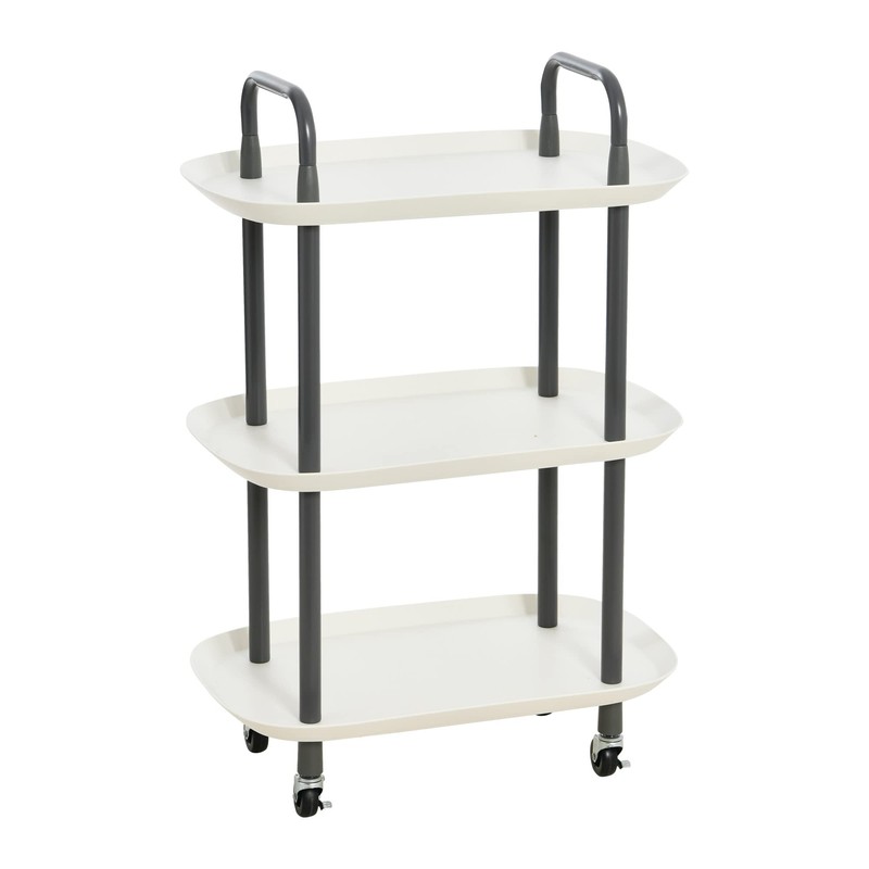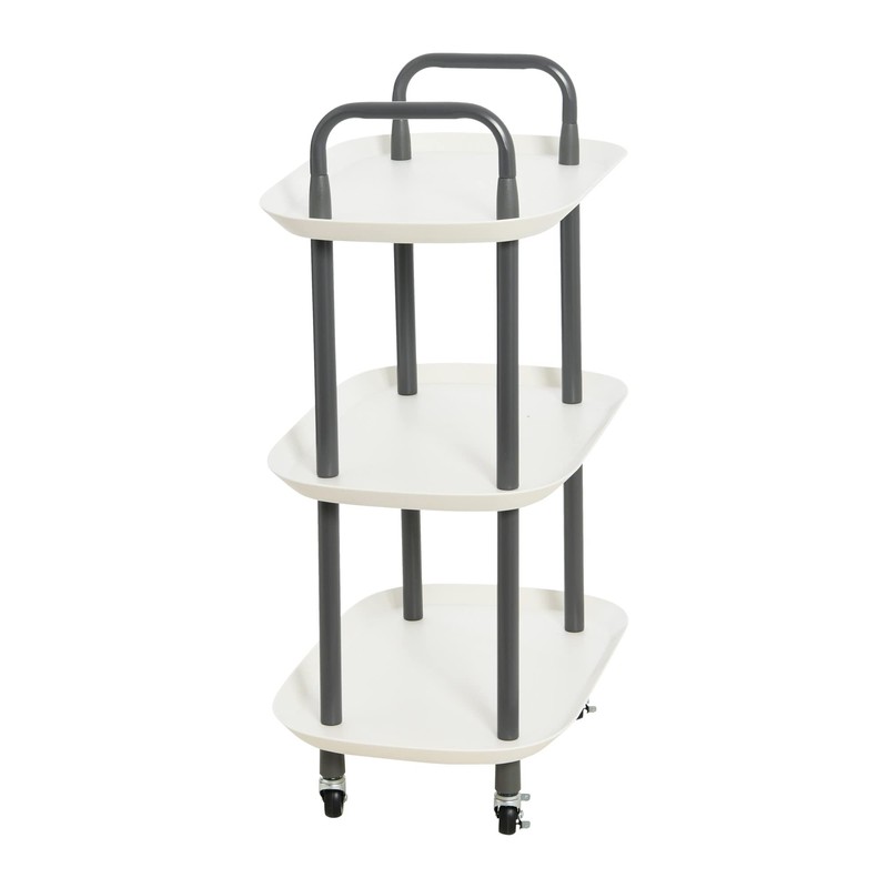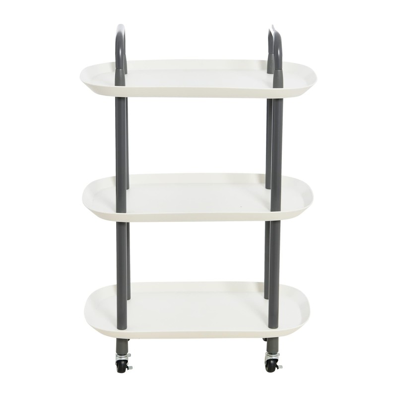 - 3-tier white plastic and dark grey steel trolley with a smooth matte finish and 4 locking casters
