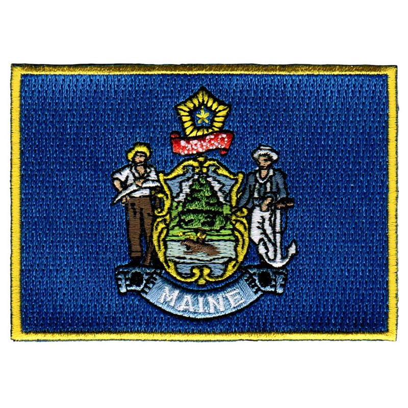 This brand new embroidered patch depicts the state flag of Maine. Heat-seal backing allows buyer to iron this patch onto virtually any fabric.