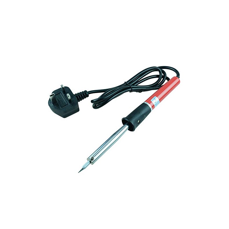 Mains powered soldering iron only featuring a UK plug and ergonomic handle suitable for a wide range of applications. Suitable for DIY Electronics, Schools & Education, Hobby & Crafts. High powered, heats up quickly and dissipates heat quickly and effectively. Please note when used for the first time, smoke will come from the tip end. This is normal for first time use and will stop shortly Excellent value Includes conical tip Voltage: 220V-240V