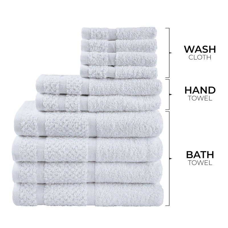- 10-piece set includes 4 bath towels, 2 hand towels, and 4 washcloths