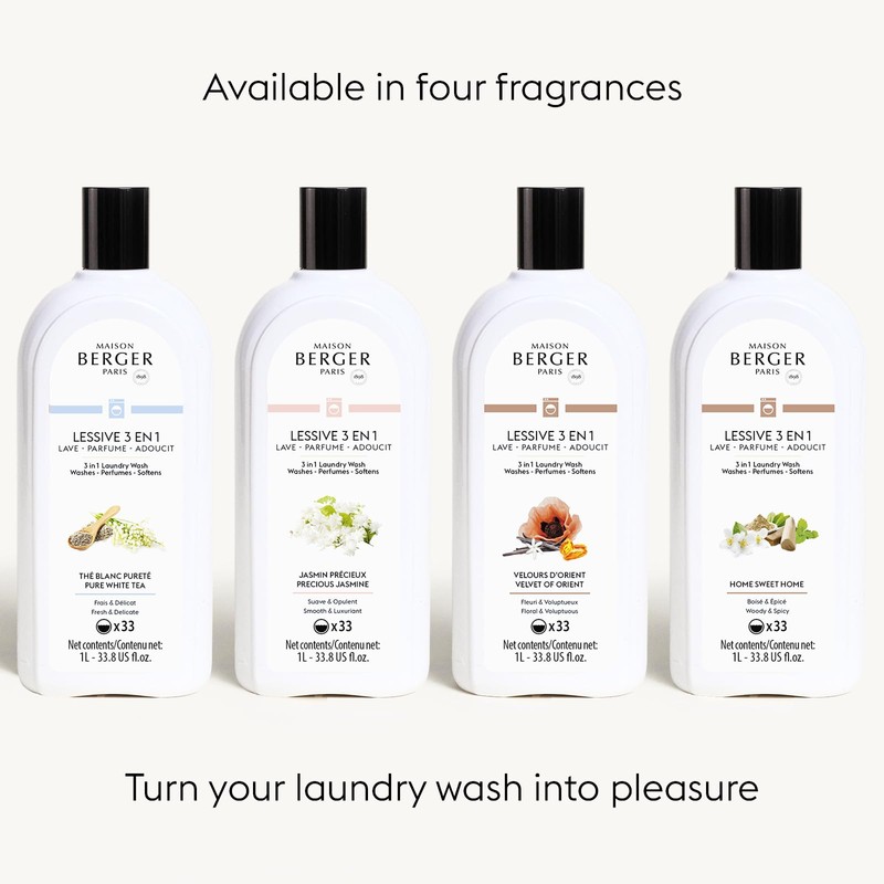 MAISON BERGER 3-in-1 Laundry Wash – Cleans, Softens, Fragrances - Fiber Protection, Phosphate-Free, Vegan - Long-Lasting Scent - HE Compatible, 1L (33 Washes) - Made in France (Pure White Tea)