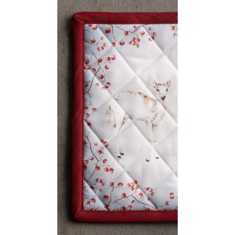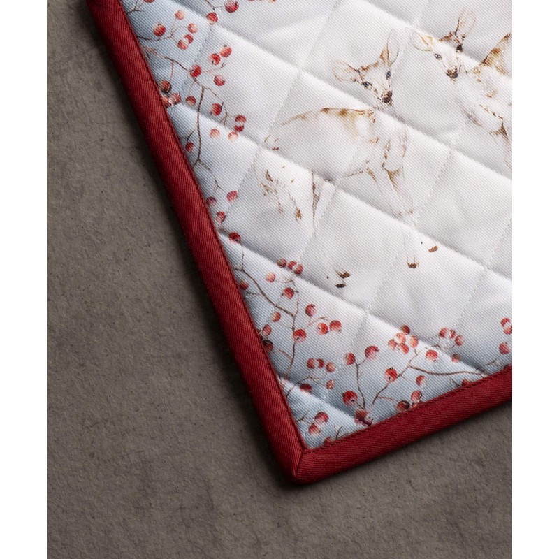 - UNIQUE DESIGN Celebrate the spirit of the season with a wonderful collection of kitchen and table linen inspired by a scene from a snowy pine forest where several reindeer are gathered. On these products, magical Christmas artwork features curious reindeers watching them graze on the low bushes and digging deep in the snow in search of food.