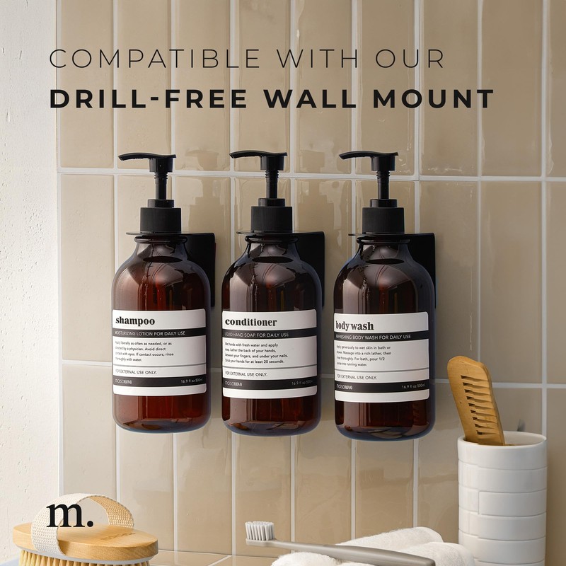 - QUALITY MATERIALS: These shower dispenser 3 chamber no drill are designed in the U.S.A and made with ISO14001 environmental standard. The shampoo and conditioner dispenser for shower set features fortified 55g PET plastic shampoo conditioner body wash dispenser for shower shampoo bottle and waterproof labels that are durable in humid environments. This shower shampoo dispenser is the perfect addition to your home.