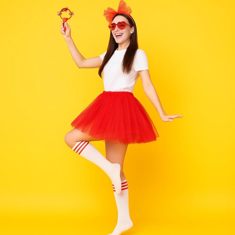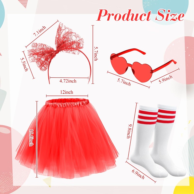 - Vibrant Red Color: celebrate color with this vivacious red ensemble, designed to standout and spark joy; The red tutu skirt, heart sunglasses, stripes socks and bow headband all sport a consistent, vibrant red shade; They are good accessories for 80s theme party, Valentine's Day, carnival, Halloween and other occasions