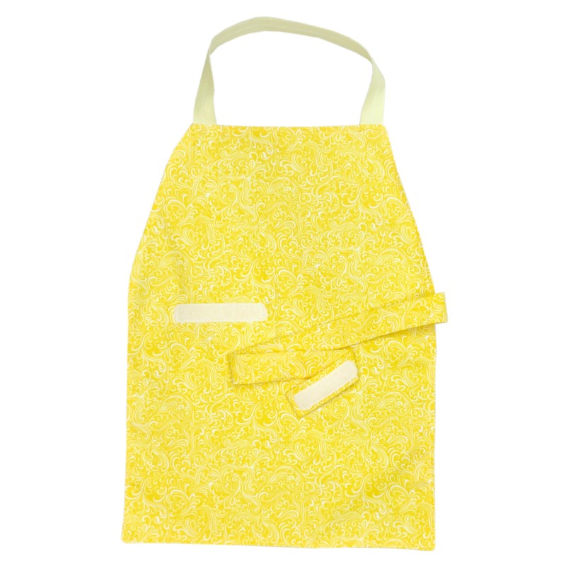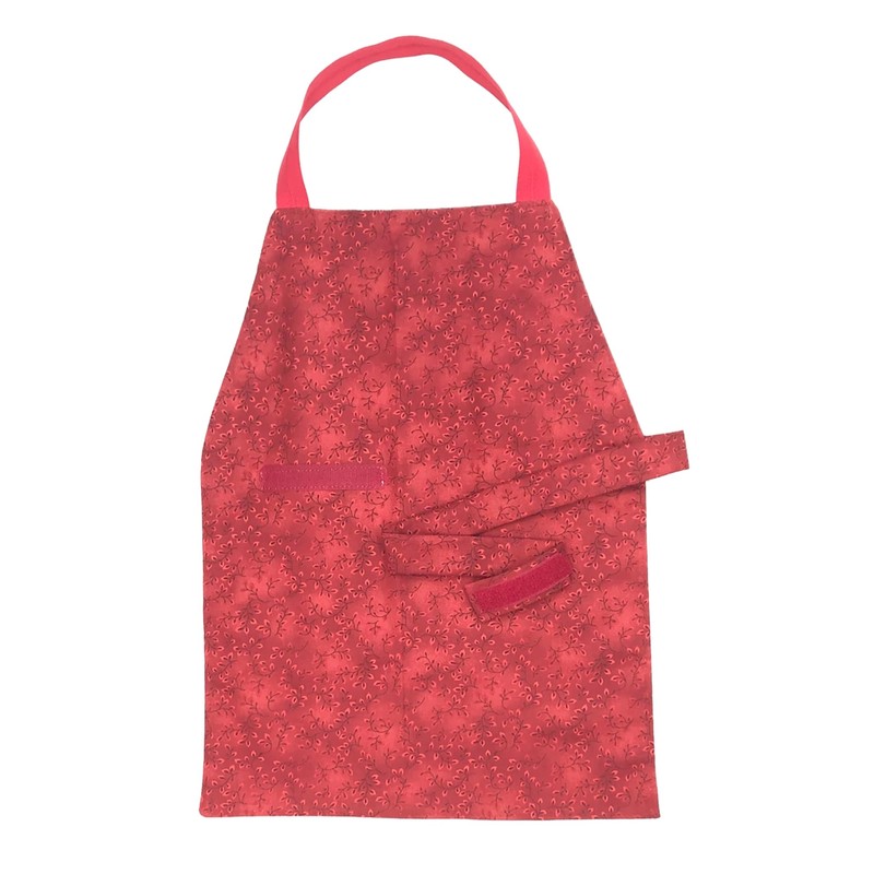 • Strong fastener: We sew 4" of velcro near the front/middle of the apron so that the child can look down and readily see what they are attaching. The strap contains 3" of velcro so that it is adjustable for larger and smaller waists. And, of course, we round the corners on the velcro so there are no pokey edges.