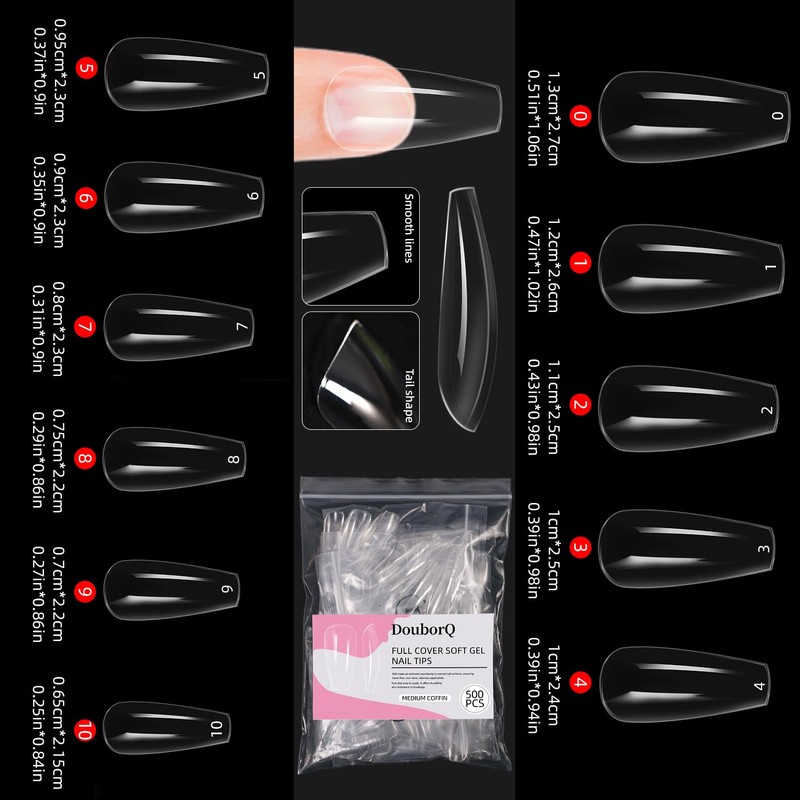 - High-Quality Nail Tips: Made from premium PMMA material, these nail tips are lightweight, durable, and offer a natural and beautiful appearance. The kit includes 500 MediumCoffin-shaped nail tips in sizes 0-11, making it easy to choose the perfect size for each finger. The mini packaging is convenient for on-the-go use.