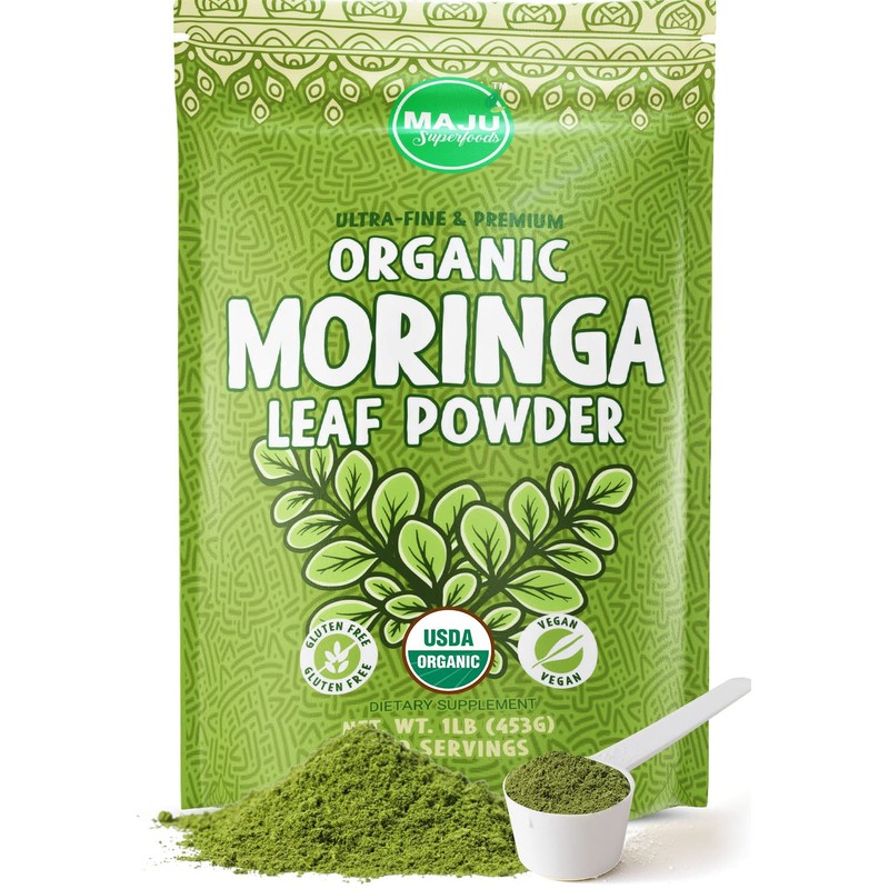 MAJU's Organic Moringa Powder (1 Pound), Oleifera Leaf, Extra-Fine Quality, Dried Drumstick Tree Leaves, For Tea, Smoothies, Food-Grade