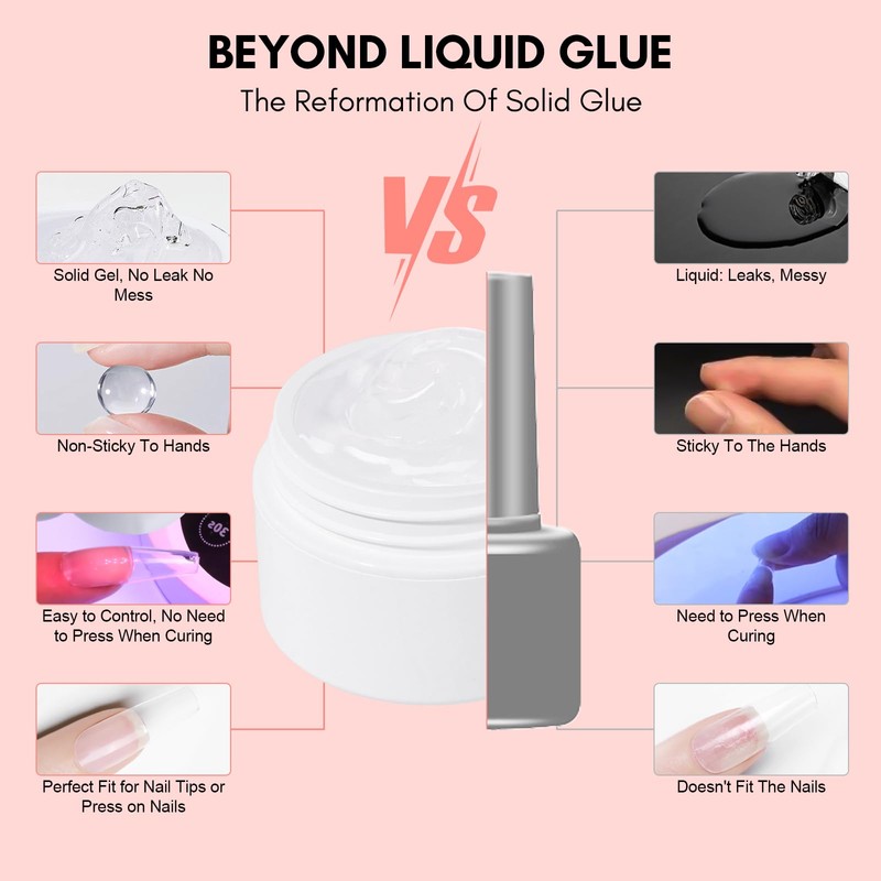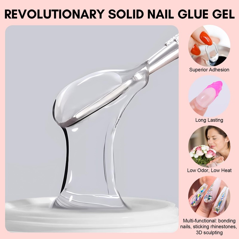 - Multi-Function Magic Solid Nail Glue Gel: This solid nail gel is a game-changer! Does not flow, don't stick to hands, it works as nail glue for acrylics nails, false nails, press on nails and soft gel tips. Say goodbye to lifting and hello to long-lasting nails! Also doubles as rhinestone glue and for 3D sculpting nail designs. Endless nail art possibilities!