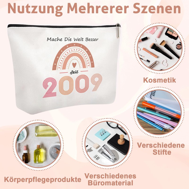 - Timeless gift for 16th birthday girls: personalised make-up bag for 16th birthday girls made of linen with cotton lining. Printed with: "Make the World Better", "Since 2009" and Rainbow.