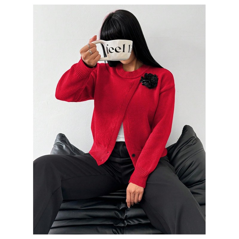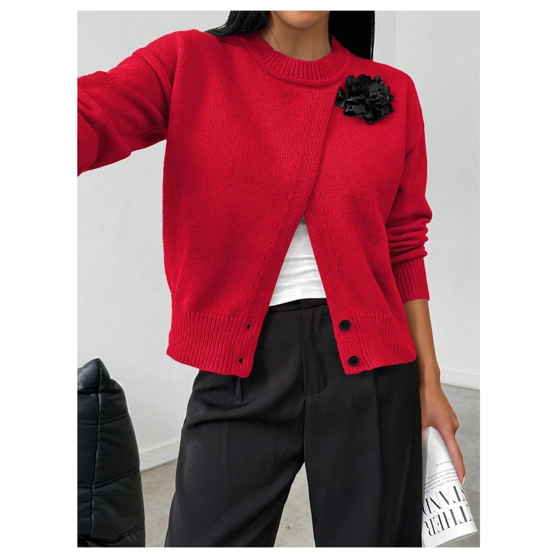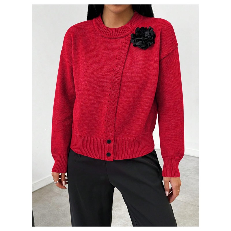 - Features: Appliques, wrapped, button front, long sleeve, knit, round neck, casual sweater for women