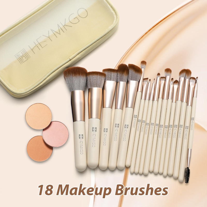 - đ©ă18PCS MAKEUP BRUSH SETăThe HEYMKGO makeup brush set is your all-in-one solution with 18 essential & professional brushes for a complete makeup experience. This set of makeup brushes include 18 versatile brushes, all elegantly packed in a stylish zipper bag for convenient portability. Itâs your go-to-travel companion, ensuring you can touch up your makeup anytime, anywhere.