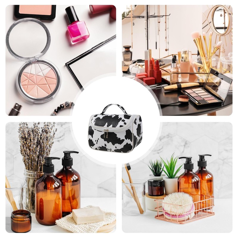 Makeup Organizer Bag - Cow Print Makeup Cosmetic Organizer Pouch - Waterproof Makeup Case Organizer, Large Capacity Travel Bag for Skincare, Shampoo, Toiletries, Women, Girls
