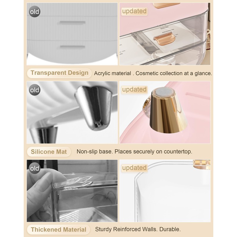 - 【Thickened Material & Non-slip】Reinforced and upgraded handle won't fall off. Easily move the skin care organizer to anywhere. The countertop organizer is made of thickened ABS material, which is stronger and more durable than normal ones. Drawer and clear top are able to open and close easily. Rubberized bottom, non-slip and won't scratch desktop.